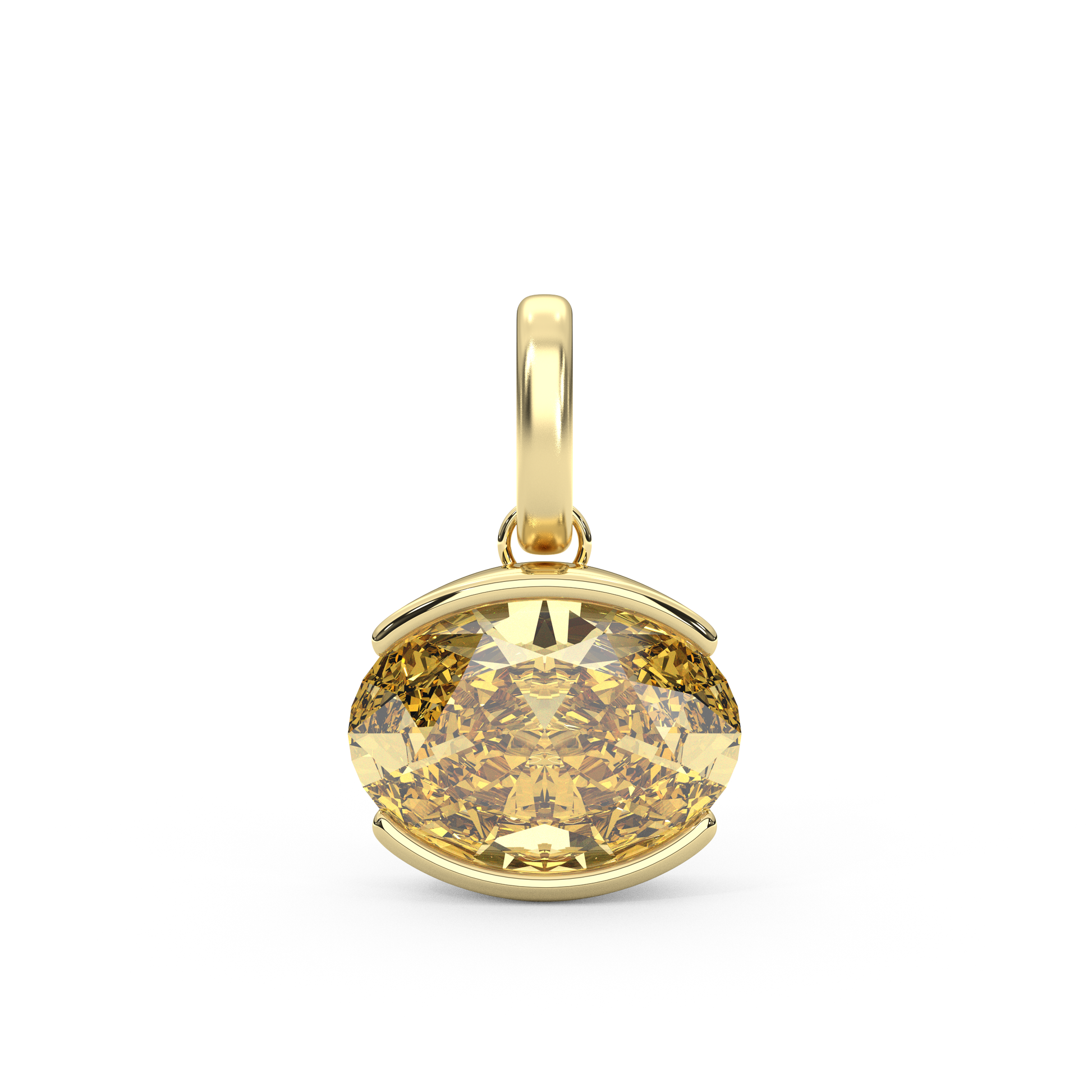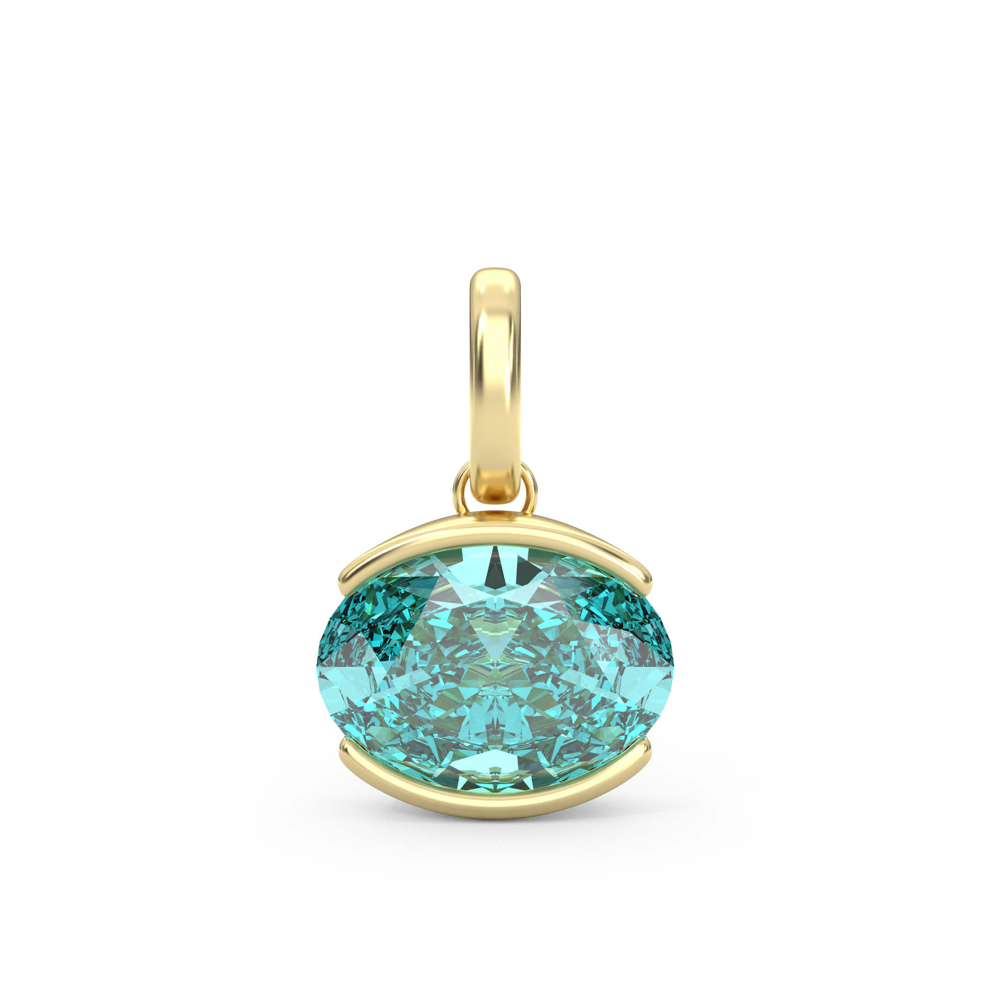 Our classic Luce Pendant - just a smaller size! This piece is a total showstopper. A 5 carat oval moissanite, set east-west for a modern twist, sits in a sleek white gold bezel that really lets the stone shine. The yellow gold bail gives it that perfect pop of warmth and contrast — it's those little details that make it special. Colored stones will come in all 14K yellow gold, and pink will come in rose gold.