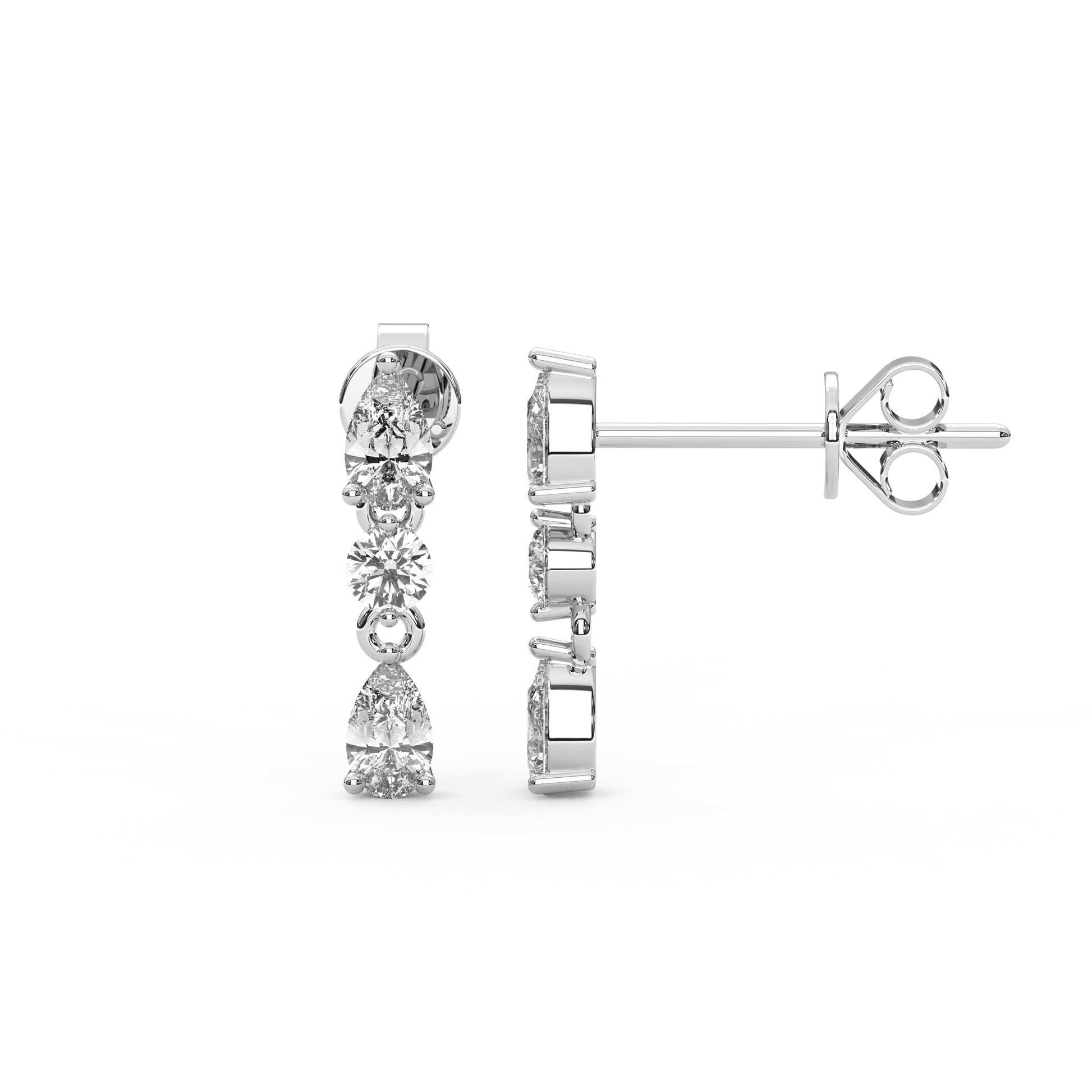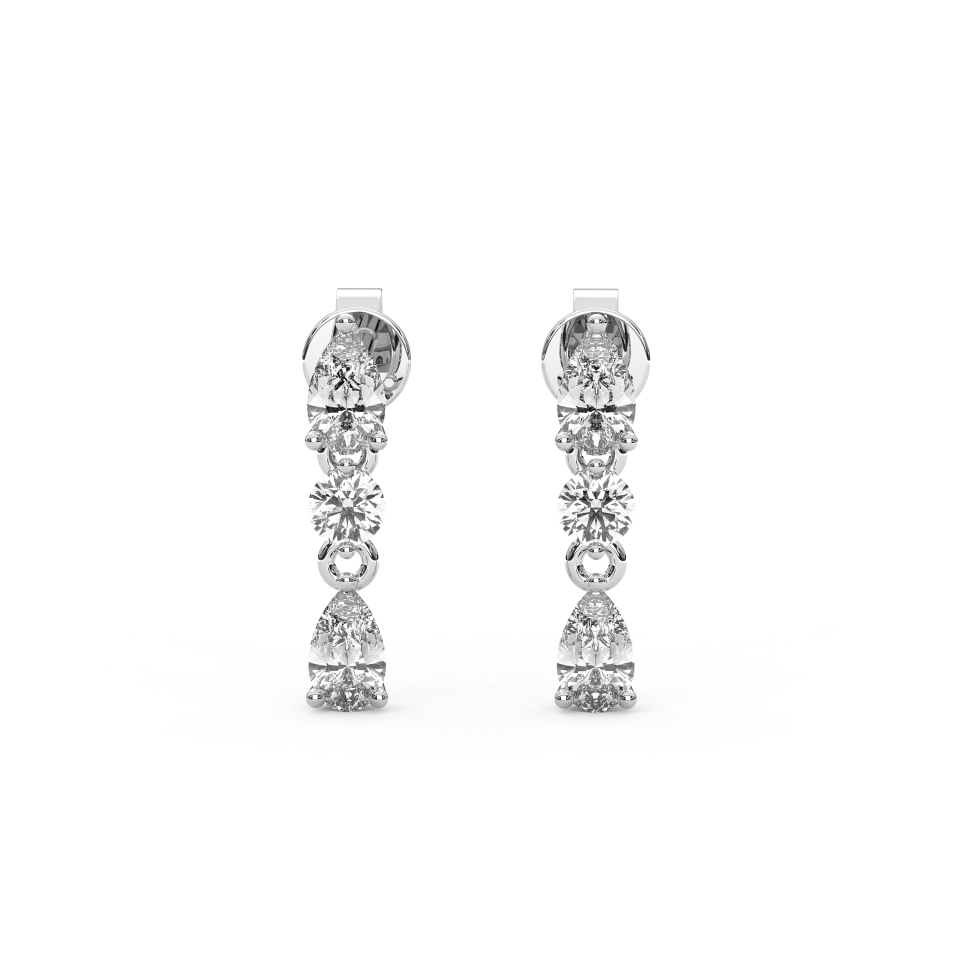 Our Pia Earrings - just mini. These three-stone earrings showcase alternating pear and round moissanites or lab diamonds, precision-set in luminous 14K White, Yellow or Rose gold. Sleek, radiant, and endlessly versatile, they’re designed to elevate your everyday style or add a modern shimmer to evening looks.