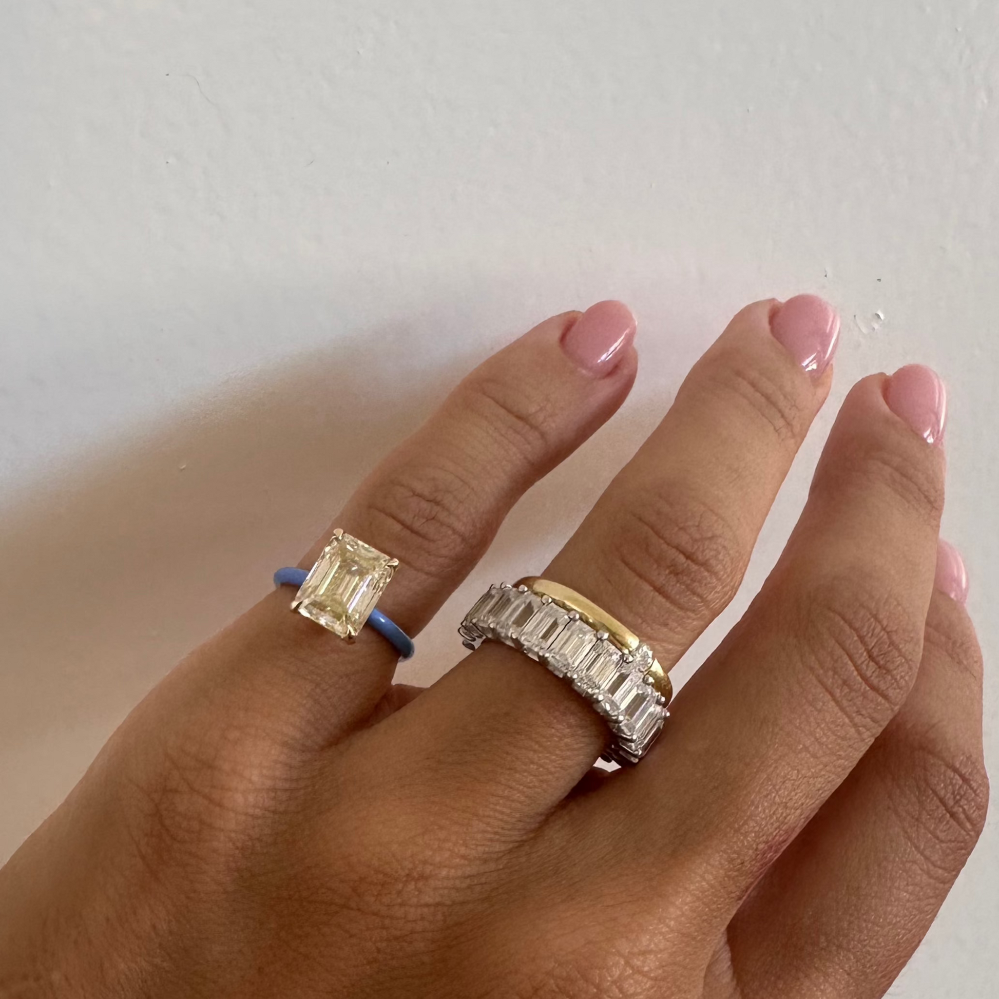 Introducing our take on a keepsake piece with a fun twist on classic pieces, made to your liking. Expertly crafted from 14K Yellow, Rose or White Gold, this stunning piece showcases a Yellow Emerald moissanite, with an enamel band in the color of your choice. It is the perfect way to add a pop of color to your stack or on its own!